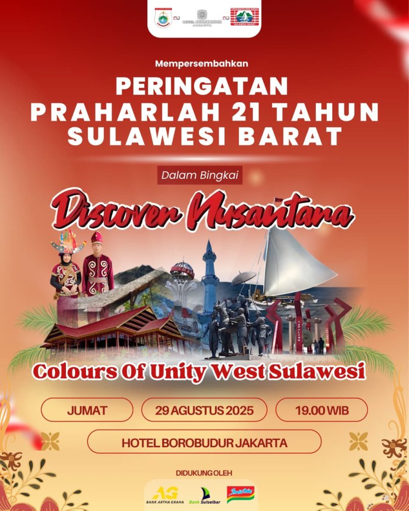 Jakarta – MataIndonesia. Kekayaan budaya dan keunikan kuliner khas Provinsi Sulawesi Barat akan dipamerkan dalam sebuah acara istimewa bertajuk “Discover Nusantara Colors of Unity West Sulawesi”. Acara ini akan diselenggarakan pada Jumat, 29 Agustus 2025, di Hotel Borobudur, Jakarta, atas kerja sama antara Badan Penghubung Provinsi Sulawesi Barat dan Badan Pengurus Pusat Kerukunan Keluarga Mandar Sulawesi Barat (KKMSB).